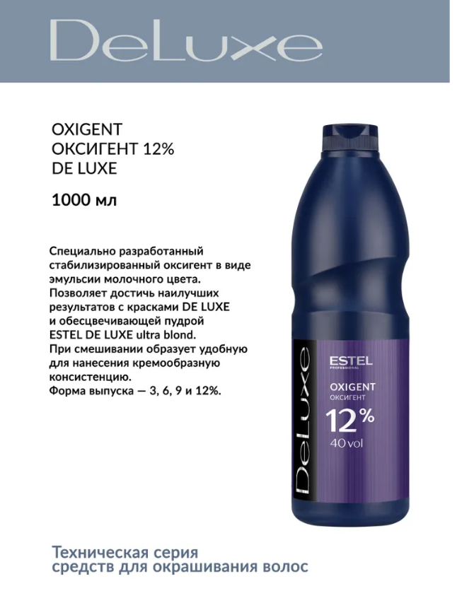 Стабилизированные оксигенты 3%, 6%, 9%, 12% в виде эмульсии молочного цвета. Позволяют доcтичь наилучших результатов с красками De Luxe