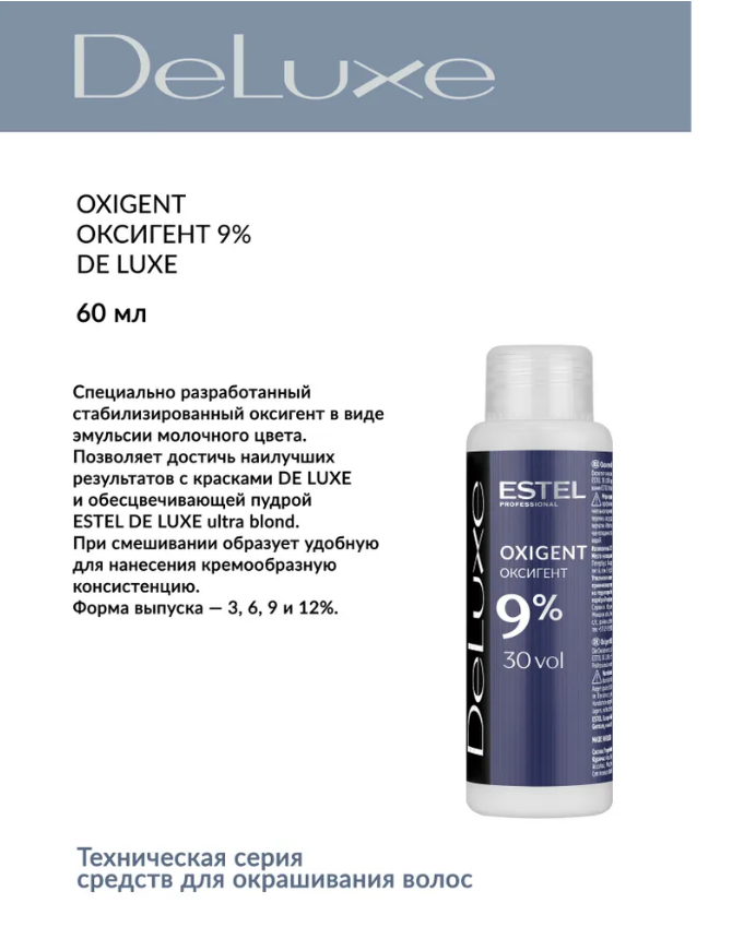 Стабилизированные оксигенты 3%, 6%, 9%, 12% в виде эмульсии молочного цвета. Позволяют доcтичь наилучших результатов с красками De Luxe