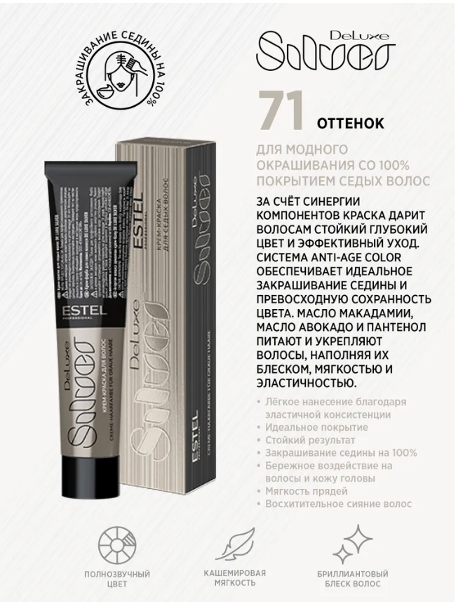 За счёт синергии компонентов краска дарит волосам стойкий глубокий цвет и эффективный уход. Система Anti-Age Color обеспечивает идеальное закрашивание седины и превосходную сохранность цвета. Масло макадамии, масло авокадо и пантенол питают и укрепляют волосы, наполняя их блеском, мягкостью и эластичностью
