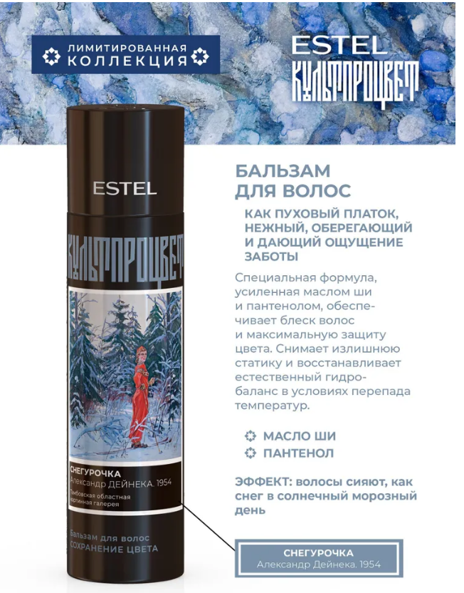 Бальзам для волос как пуховый платок, нежный, оберегающий и дающий ощущение заботы. Специальная формула, усиленная маслом ши и пантенолом, обеспечивает блеск волос и максимальную защиту цвета. Снимает излишнюю статику и восстанавливает естественный гидробаланс в условиях перепада температур. Придаёт волосам гладкость и эластичность. Эффект: волосы сияют, как снег в солнечный морозный день.