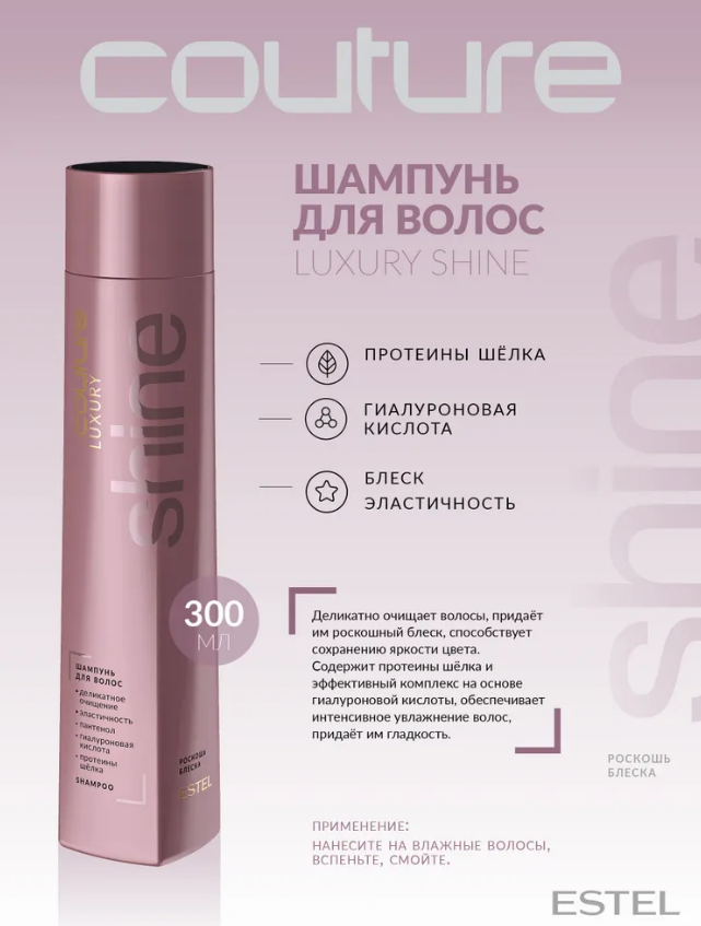 Протеины шёлка придают волосам гладкость и повышают устойчивость к повреждениям. Параллельно с этим комплекс на основе гиалуроновой кислоты интенсивно увлажняет пряди, делая их мягкими и эластичными