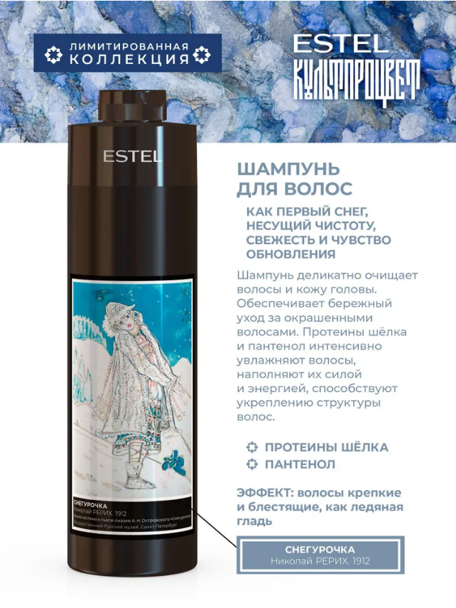 В продуктах коллекции ESTEL КУЛЬТПРОЦВЕТ раскрывается образ Снегурочки: её хрупкая красота несёт в себе большую силу. Снегурочка выступает как светлый дух зимы, сохраняет целостность мира. Покрывая всё вокруг снегом, зима даёт природе долгожданный отдых и обеспечивает восстановление до прихода весны. Линия продуктов повторяет естественный цикл, даря волосам защиту, сохранение цвета и укрепление структуры. ESTEL КУЛЬТПРОЦВЕТ соединяет магию древнего образа, силу искусства и современные формулы для ухода за волосами