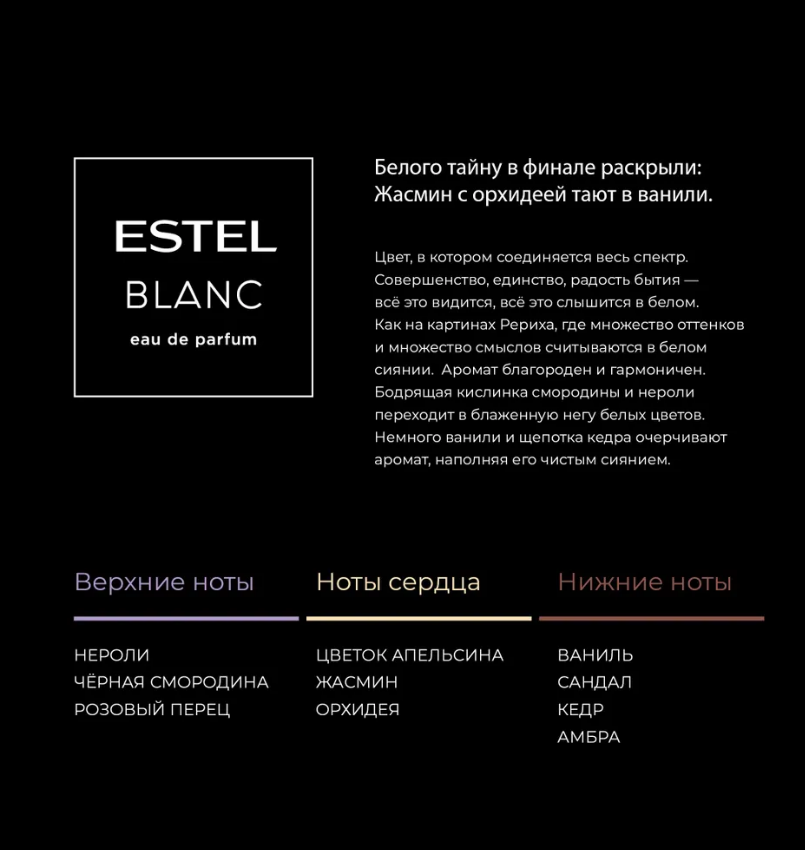 Яркий аромат одноименного парфюма от ESTEL нежно обволакивает волосы. Чувственный и стойкий аромат раскрывается постепенно, переходя от верхних нот нероли, черной смородины и розового перца к нотам цветов апельсина, жасмина и орхидеи с аккордами ванили и кедра