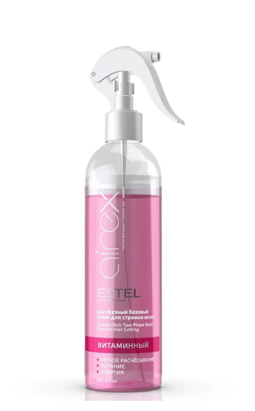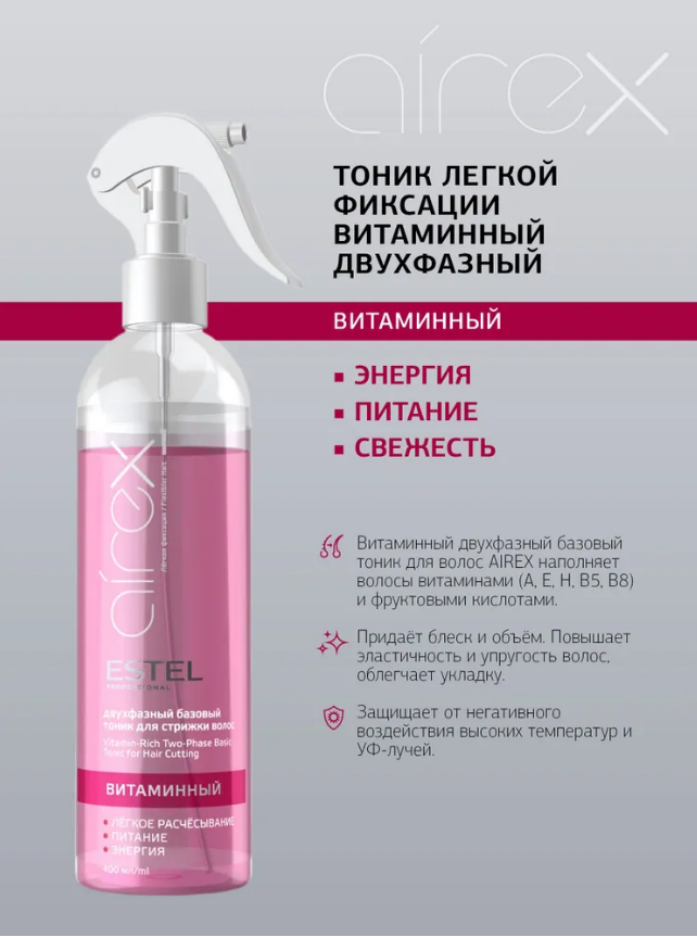 Витаминный двухфазный базовый тоник для волос AIREX наполняет волосы витаминами (А, Е, Н, В5, В8) и фруктовыми кислотами. Придаёт блеск и объём. Повышает эластичность и упругость волос, облегчает укладку. Защищает от негативного воздействия высоких температур и УФ-лучей.